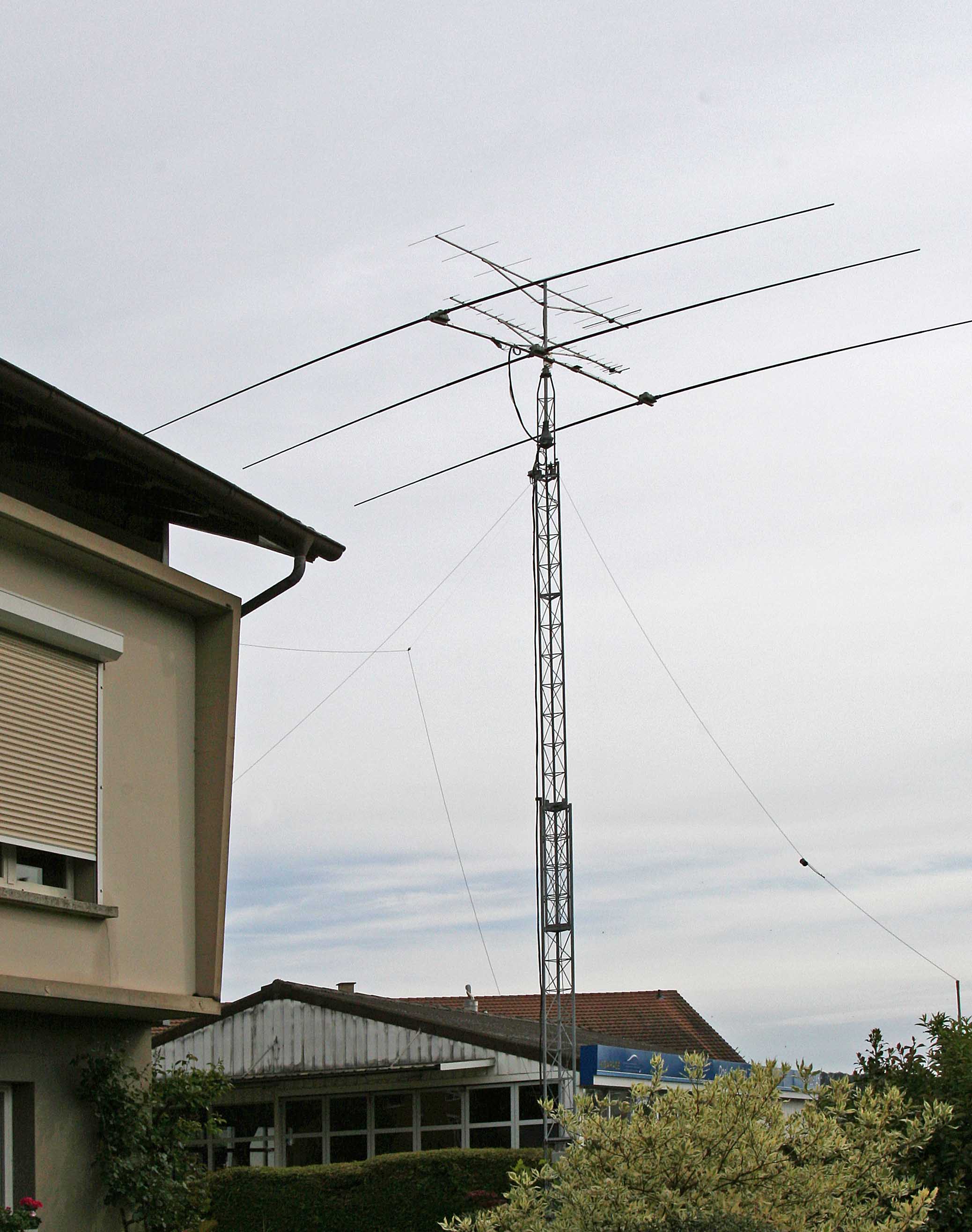 Meine Antennen sind auf einem Gittermast rund 14m über Grund. Von oben nach unten sind dies die UKW (2m) 9 El. Yagi, darunter die 19 El. UHF (70cm), dann die 3 Element SteppIR KW Antenne (20m - 6m Band).